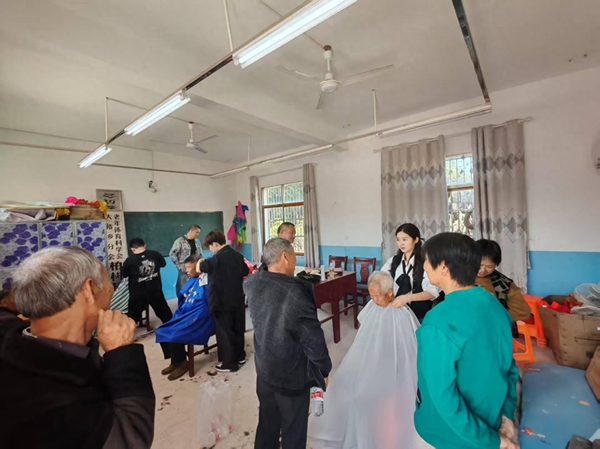 修水修江醫(yī)院的醫(yī)師團(tuán)隊(duì)現(xiàn)場(chǎng)坐診,為老人量血壓、測(cè)血糖、問(wèn)診開(kāi)方,29人完成義診登記,7人獲得復(fù)查建議。老人們?cè)诩议T(mén)口就享受到了專家級(jí)的健康守護(hù)?!盎ㄐ乃肌敝驹阜?wù)隊(duì)的理發(fā)師們則讓47位老人“煥然一新”,剪刀起落間滿是幸福笑容。
