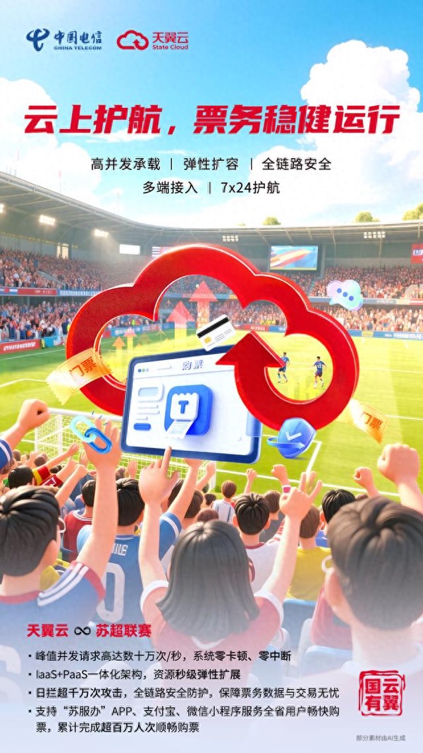 為保障票務(wù)公平、提升服務(wù)效率,“蘇超”攜手天翼云構(gòu)建了全省統(tǒng)一的云端票務(wù)系統(tǒng)。在天翼公有云“IaaS+PaaS”一體化資源高可靠、彈性可擴(kuò)展能力的支撐下,該系統(tǒng)以“蘇服辦”APP及支付寶、微信小程序等多端為入口,實(shí)現(xiàn)了“一點(diǎn)預(yù)約、全省通認(rèn)”,成功平穩(wěn)地承接了多輪售票高峰,有效保障了球迷購(gòu)票流程的順暢與公平。