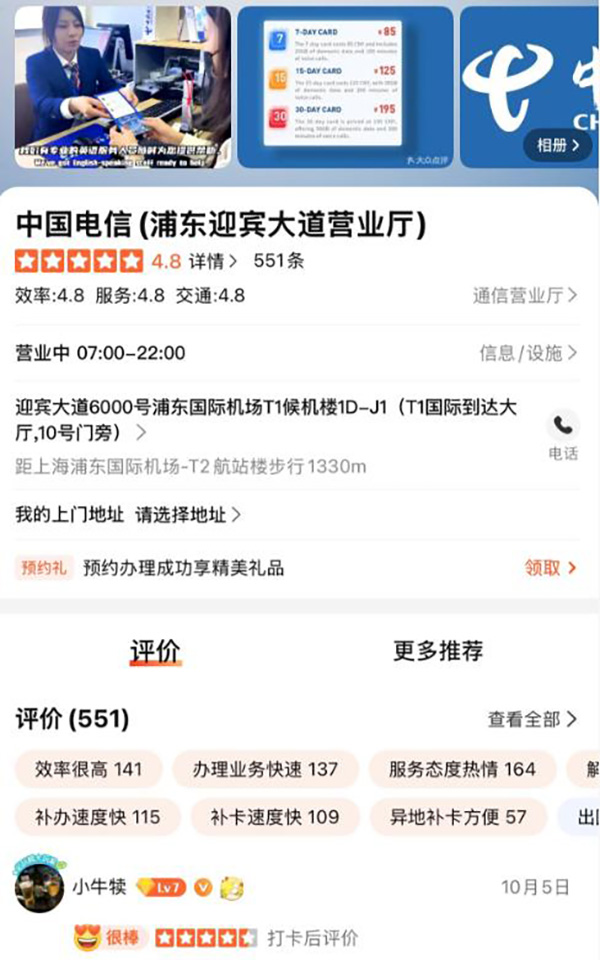 自2025年1月正式營業(yè)后,4月同步開啟“大眾點評”平臺的運營,如今這里已成機場里的“網(wǎng)紅服務點”:550多條好評、4.8高分、便民服務星級排名穩(wěn)居前1%,更是上海通信運營商中評分第一的營業(yè)廳。
