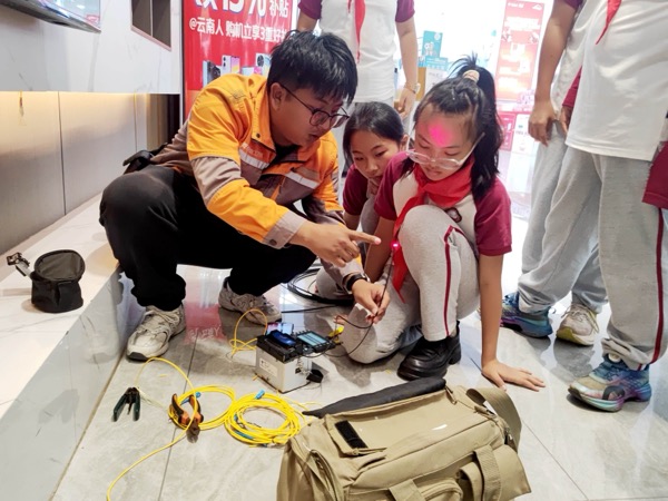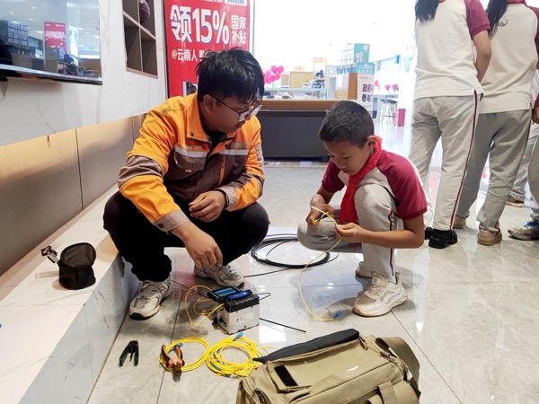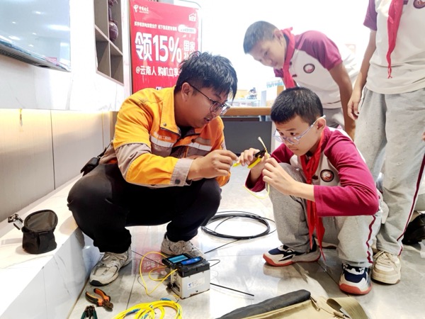 近日,云南省普洱市思茅三小學(xué)生走進(jìn)中國(guó)電信普洱分公司世紀(jì)廣場(chǎng)營(yíng)業(yè)廳,開(kāi)展通信科技實(shí)踐活動(dòng)。在智慧家庭工程師指導(dǎo)下,學(xué)生們通過(guò)理論講解、設(shè)備演示及動(dòng)手實(shí)操,深入了解了現(xiàn)代通信技術(shù)?;顒?dòng)中,工作人員以"手機(jī)心臟"比喻芯片功能,借助光貓、路由器等設(shè)備直觀演示家庭網(wǎng)絡(luò)"信號(hào)接力"原理。智慧家庭工程師現(xiàn)場(chǎng)操作光纖熔接機(jī),以高壓電弧精準(zhǔn)熔合發(fā)絲細(xì)的光纖,搭建起"信號(hào)傳輸橋梁",并對(duì)比講解FTTR技術(shù)突破——該技術(shù)通過(guò)光纖到房間實(shí)現(xiàn)全屋千兆覆蓋,有效解決傳統(tǒng)WiFi穿墻信號(hào)衰減問(wèn)題。實(shí)操環(huán)節(jié)學(xué)生分組體驗(yàn)光纖整理、設(shè)備連接等項(xiàng)目,嘗試光貓路由器組網(wǎng)及光纖護(hù)套剝離,現(xiàn)場(chǎng)測(cè)試全屋無(wú)死角信號(hào)覆蓋效果?;顒?dòng)通過(guò)"理論+實(shí)踐"模式,幫助學(xué)生從科技使用者轉(zhuǎn)變?yōu)榭萍继剿髡?,激發(fā)對(duì)通信技術(shù)的興趣。