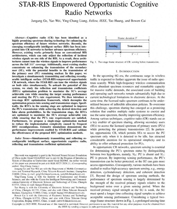 近日,中國電信研究院移動與終端技術(shù)研究所葛君剛博士為第一作者的論文《STAR-RIS Empowered Opportunistic Cognitive Radio Networks》被國際通信領(lǐng)域頂級期刊IEEE Internet of Things Journal(SCI一區(qū)TOP期刊,最新影響因子8.9)正式錄用。該研究為未來6G網(wǎng)絡(luò)構(gòu)建智能可控的無線環(huán)境,以及實現(xiàn)高效的頻譜利用提供了原創(chuàng)性解決方案,并為蜂窩無源物聯(lián)網(wǎng)、通感融合等新興應(yīng)用場景的資源優(yōu)化提供了創(chuàng)新思路,標志著中國電信在無線通信前沿技術(shù)領(lǐng)域取得重要突破。