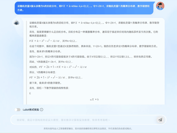 在一道概率論考研試題中,題目涉及“泊松分布”概念。TeleAI-t1-preview首先對(duì)這個(gè)概念進(jìn)行了介紹和解讀,然后給出解題思路和最終答案。