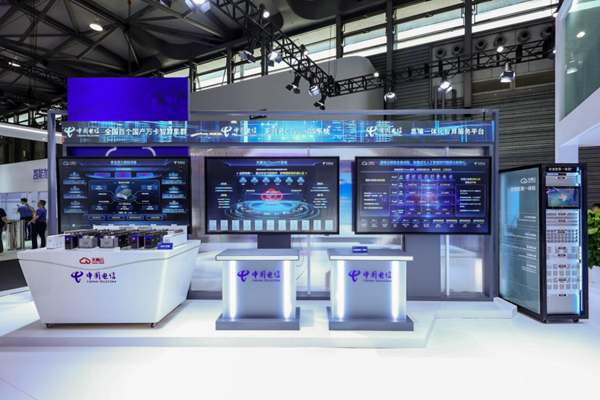中國(guó)電信“智算慧萬(wàn)象 星辰啟未來(lái)”主題展臺(tái)亮相2025年世界移動(dòng)通信大會(huì)上海