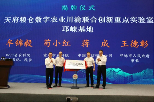 中國電信四川公司副總經(jīng)理蔣成與四川省農(nóng)業(yè)科學(xué)院黨委書記牟錦毅、重慶市農(nóng)業(yè)科學(xué)院院長茍小紅、邛崍市人民政府市長王德彰共同為天府糧倉數(shù)字農(nóng)業(yè)川渝聯(lián)合創(chuàng)新重點(diǎn)實(shí)驗室揭牌。