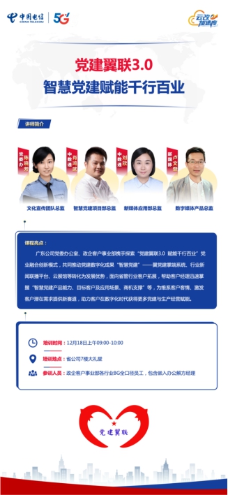 2023年,廣東電信積極發(fā)揮信息化建設(shè)國家隊(duì)主力軍優(yōu)勢(shì),創(chuàng)新探索思想建設(shè)、組織建設(shè)、作風(fēng)建設(shè)等黨建工作數(shù)字化智慧化,做示范、搭平臺(tái)、建隊(duì)伍,整合資源形成多個(gè)超千萬元級(jí)智慧黨建品牌成果,推動(dòng)超千次智慧黨建乘“云”而上,認(rèn)證超百位智慧黨建支撐專家,把黨建優(yōu)勢(shì)轉(zhuǎn)化為發(fā)展優(yōu)勢(shì),賦能千行百業(yè),以高質(zhì)量黨建引領(lǐng)保障高質(zhì)量發(fā)展。