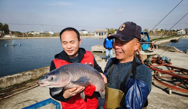 12月27日9時許,在無錫市錫山區(qū)鵝湖鎮(zhèn)松芝村的青魚標(biāo)準(zhǔn)化養(yǎng)殖基地,魚歡浪涌,養(yǎng)殖戶們熟練地下網(wǎng)、圍塘、捕撈。