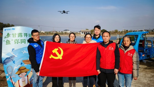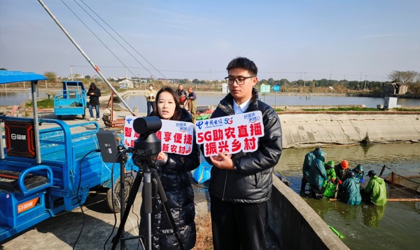 中國電信5G直播間架設(shè)在魚塘邊,為農(nóng)戶直播帶貨;無人機在空中盤旋,實時監(jiān)測魚塘數(shù)據(jù)。蹦跳的大青魚首次成為直播間的“嘉賓”,與多方網(wǎng)民互動。養(yǎng)殖戶們借助數(shù)字化、網(wǎng)絡(luò)化、智能化的天地空直播網(wǎng),分享惠民、利民、樂民的智慧鄉(xiāng)村新成果。