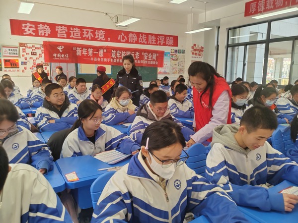 近日,中國電信江蘇豐縣分公司“愛心翼站”工作人員攜手公安民警,來到豐縣初級中學(xué)開展“新年反詐第一課”公益宣傳活動。電信志愿者結(jié)合游戲充值等類型案例為同學(xué)們細(xì)致講解反詐常識,采取有獎問答等方式營造熱烈的宣傳氛圍,筑牢校園反詐防騙“安全網(wǎng)”,守護(hù)純凈校園。