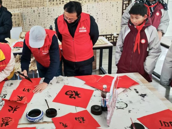 孩子們圍在志愿者身旁,好奇地觀看著這一傳統(tǒng)書寫過程,眼神中充滿了敬畏與向往。一些膽大的孩子在志愿者的鼓勵(lì)與指導(dǎo)下,也紛紛拿起毛筆,嘗試書寫屬于自己的“?!弊?。志愿者還完成了一幅充滿網(wǎng)絡(luò)韻味的春聯(lián):網(wǎng)絡(luò)鋪春數(shù)字鄉(xiāng)村添秀色 ,電信煥彩智慧校園換新顏。志愿者們將寫好的福字和春聯(lián)一一送到孩子們手中,親切地祝愿他們?cè)谛碌囊荒昀锝】悼鞓烦砷L(zhǎng),學(xué)業(yè)蒸蒸日上。拿到福字的孩子們臉上洋溢著幸福的笑容,仿佛手中握住的不僅僅是一張紅紙黑字,更是一份沉甸甸的新春祝福與文化傳承。不僅讓孩子們感受到了中華傳統(tǒng)文化的博大精深,更在他們心中種下了熱愛傳統(tǒng)文化的種子。