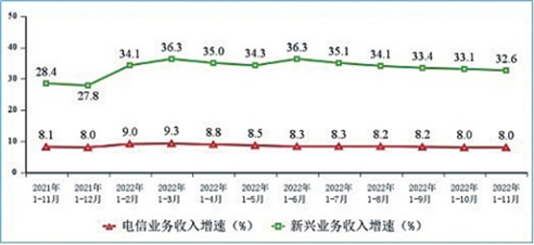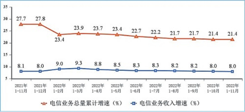 電信業(yè)務收入平穩(wěn)增長,電信業(yè)務總量保持高速增長。1—11月,電信業(yè)務收入累計完成14504億元,同比增長8%,按照上年不變價計算的電信業(yè)務總量同比增長21.4%,量收增速均與1—10月持平。