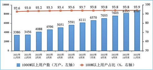 固定寬帶接入用戶穩(wěn)步增加,千兆用戶規(guī)模持續(xù)擴大。截至11月末,三家基礎電信企業(yè)的固定互聯(lián)網(wǎng)寬帶接入用戶總數(shù)達5.87億,比上年末凈增5117萬戶。其中,100Mbps及以上接入速率的固定互聯(lián)網(wǎng)寬帶接入用戶達5.51億戶,占總用戶數(shù)的93.9%;1000Mbps及以上接入速率的固定互聯(lián)網(wǎng)寬帶接入用戶達8707萬戶,比上年末凈增5248萬戶,占總用戶數(shù)的14.8%,占比較1—10月提升0.9個百分點。