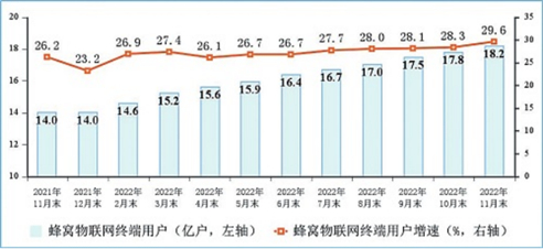 “物超人”步伐持續(xù)加大,IPTV用戶穩(wěn)步增長。截至11月末,三家基礎電信企業(yè)發(fā)展蜂窩物聯(lián)網(wǎng)終端用戶18.18億戶,比上年末凈增4.21億戶;已超移動電話用戶1.34億戶,占移動網(wǎng)終端連接數(shù)(包括移動電話用戶和蜂窩物聯(lián)網(wǎng)終端用戶)的比重達51.9%。IPTV(網(wǎng)絡電視)總用戶數(shù)達3.76億,比上年末凈增2705萬戶。
