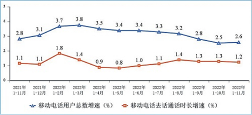 移動電話通話量低速增長,移動短信業(yè)務量增速持續(xù)回升。1—11月,移動電話去話通話時長完成2.1萬億分鐘,同比增長1.2%;固定電話主叫通話時長完成768.6億分鐘,同比下降10%。1—11月,全國移動短信業(yè)務量同比增長5.9%,移動短信業(yè)務收入同比增長2.5%,增速較1—10月分別提升1.5個和0.9個百分點。