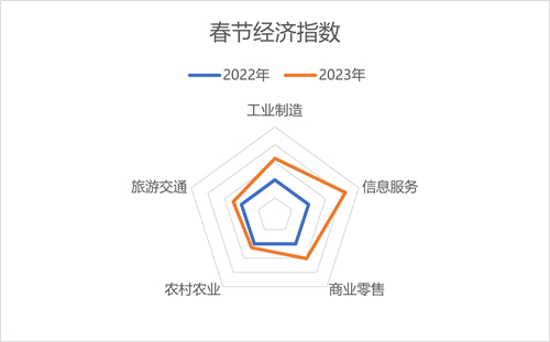 防疫優(yōu)化調(diào)整和疫情達(dá)峰回落,為春節(jié)期間經(jīng)濟恢復(fù)創(chuàng)造了條件,全國人口流動性的顯著提升,多項產(chǎn)業(yè)釋放積極信號。我們綜合分析工業(yè)制造、信息服務(wù)、商業(yè)零售、農(nóng)村農(nóng)業(yè)、旅游交通五大行業(yè)數(shù)據(jù),春節(jié)經(jīng)濟指數(shù)較2022年春節(jié)期間同比增長5.2%,五大行業(yè)指標(biāo)均有提升,綜合經(jīng)濟水平積極向好,迎來強勁復(fù)蘇。