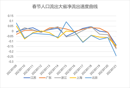 人口遷徙方面,跨省外來務(wù)工人員集中的省份,在節(jié)前出現(xiàn)了大規(guī)模的人員凈流出,比如廣東、浙江、江蘇等沿海經(jīng)濟大省。節(jié)前人員凈流出最大的5個省 (市),累計流出規(guī)模較去年同期增長了14.1%。