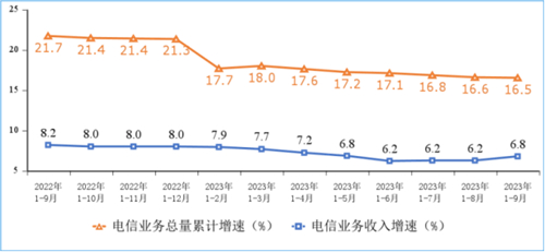 電信業(yè)務(wù)收入增速小幅回升。前三季度,電信業(yè)務(wù)收入累計(jì)完成12813億元,同比增長(zhǎng)6.8%,增速較上半年提升0.6個(gè)百分點(diǎn)。按照上年不變價(jià)計(jì)算的電信業(yè)務(wù)總量同比增長(zhǎng)16.5%。