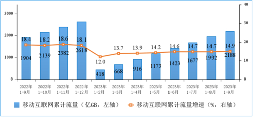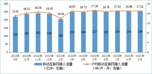 移動(dòng)互聯(lián)網(wǎng)流量增速小幅提升,9月DOU值達(dá)17GB/戶。前三季度,移動(dòng)互聯(lián)網(wǎng)累計(jì)流量達(dá)2188億GB,同比增長(zhǎng)14.9%,增速較上半年提升0.3個(gè)百分點(diǎn)。截至9月末,移動(dòng)互聯(lián)網(wǎng)用戶數(shù)達(dá)15.1億戶,比上年末凈增5471萬戶。9月當(dāng)月戶均移動(dòng)互聯(lián)網(wǎng)接入流量(DOU)達(dá)到17.01GB/戶·月,同比增長(zhǎng)13.4%,較上年12月份高0.83GB/戶·月。