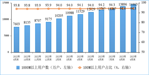 固定寬帶接入用戶持續(xù)向千兆帶寬升級(jí)。截至9月末,三家基礎(chǔ)電信企業(yè)的固定互聯(lián)網(wǎng)寬帶接入用戶總數(shù)達(dá)6.3億戶,比上年末凈增4019萬戶。其中,100Mbps及以上接入速率的固定互聯(lián)網(wǎng)寬帶接入用戶達(dá)5.94億戶,占總用戶數(shù)的94.3%,占比較上年末提升0.4個(gè)百分點(diǎn);1000Mbps及以上接入速率的固定互聯(lián)網(wǎng)寬帶接入用戶達(dá)1.45億戶,比上年末凈增5289萬戶,占總用戶數(shù)的23%。