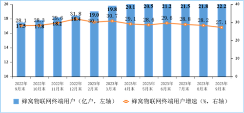 蜂窩物聯(lián)網(wǎng)用戶較快增長(zhǎng),IPTV(網(wǎng)絡(luò)電視)用戶穩(wěn)步增加。截至9月末,三家基礎(chǔ)電信企業(yè)發(fā)展蜂窩物聯(lián)網(wǎng)終端用戶22.2億戶,比上年末凈增3.77億戶,占移動(dòng)網(wǎng)終端連接數(shù)(包括移動(dòng)電話用戶和蜂窩物聯(lián)網(wǎng)終端用戶)的比重達(dá)56.3%。IPTV(網(wǎng)絡(luò)電視)總用戶數(shù)達(dá)3.96億戶,比上年末凈增1593萬戶。