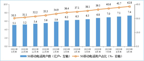 移動(dòng)電話用戶數(shù)穩(wěn)步增長(zhǎng),5G用戶規(guī)模加速擴(kuò)大。截至9月末,三家基礎(chǔ)電信企業(yè)的移動(dòng)電話用戶總數(shù)達(dá)17.23億戶,比上年末凈增3933萬戶。其中,5G移動(dòng)電話用戶達(dá)7.37億戶,比上年末凈增17654萬戶,占移動(dòng)電話用戶的42.8%,占比較上年末提高9.5個(gè)百分點(diǎn)。