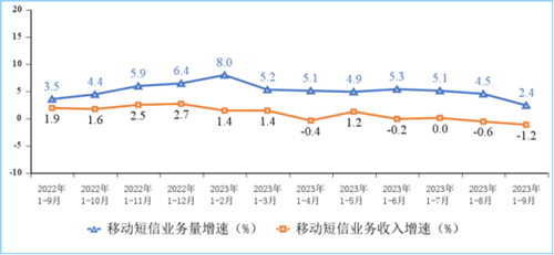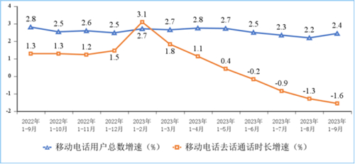 傳統(tǒng)通信業(yè)務(wù)持續(xù)收縮。前三季度,移動(dòng)電話去話通話時(shí)長(zhǎng)完成1.69萬億分鐘,同比下降1.6%;固定電話主叫通話時(shí)長(zhǎng)完成596.1億分鐘,同比下降5.2%。前三季度,全國(guó)移動(dòng)短信業(yè)務(wù)量同比增長(zhǎng)2.4%,移動(dòng)短信業(yè)務(wù)收入同比下降1.2%,增速較上半年分別回落2.9個(gè)和1個(gè)百分點(diǎn)。