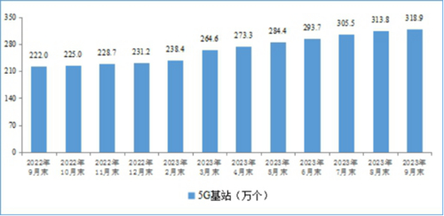 5G網(wǎng)絡(luò)建設(shè)持續(xù)推進(jìn)。截至9月末,我國(guó)移動(dòng)電話基站總數(shù)達(dá)1143萬個(gè),比上年末凈增59.8萬個(gè)。其中,5G基站總數(shù)達(dá)318.9萬個(gè),占移動(dòng)基站總數(shù)的27.9%。