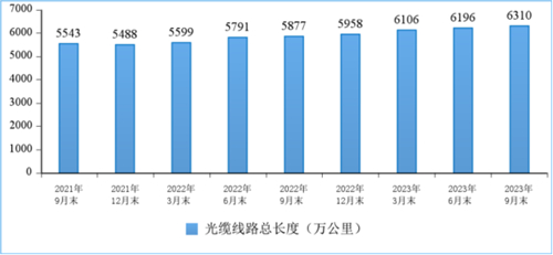 光纜線路總長(zhǎng)度穩(wěn)步增長(zhǎng)。截至9月末,全國(guó)光纜線路總長(zhǎng)度達(dá)到6310萬公里,比上年末凈增351.7萬公里。其中接入網(wǎng)光纜、本地網(wǎng)中繼光纜和長(zhǎng)途光纜線路所占比重分別為62.3%、35.9%和1.8%。