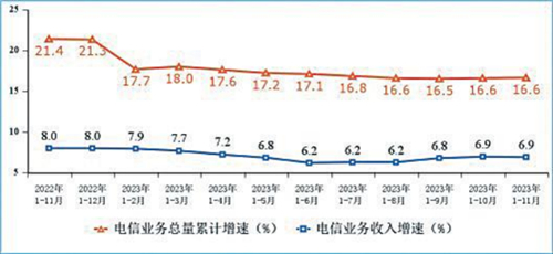 電信業(yè)務(wù)量收實(shí)現(xiàn)平穩(wěn)增長(zhǎng)。1—11月,電信業(yè)務(wù)收入累計(jì)完成15548億元,同比增長(zhǎng)6.9%,按照上年不變價(jià)計(jì)算的電信業(yè)務(wù)總量同比增長(zhǎng)16.6%,量收增速均與1—10月持平。