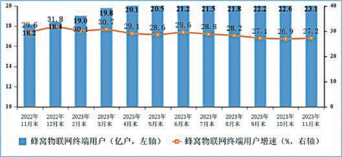 蜂窩物聯(lián)網(wǎng)用戶較快增長(zhǎng),IPTV用戶穩(wěn)步增加。截至11月末,三家基礎(chǔ)電信企業(yè)發(fā)展蜂窩物聯(lián)網(wǎng)終端用戶23.12億戶,比上年末凈增46772萬(wàn)戶,占移動(dòng)網(wǎng)終端連接數(shù)(包括移動(dòng)電話用戶和蜂窩物聯(lián)網(wǎng)終端用戶)的比重達(dá)57.3%。IPTV總用戶數(shù)達(dá)3.99億戶,比上年末凈增1878萬(wàn)戶。