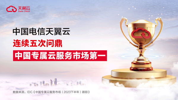 近日,國際數(shù)據(jù)公司IDC發(fā)布的《中國專屬云服務(wù)市場(2023下半年)跟蹤》報告顯示,2023下半年,專屬云服務(wù)整體市場規(guī)模同比增長18.0%。中國電信天翼云以21.8%的市場份額,蟬聯(lián)中國專屬云服務(wù)市場第一。天翼云連續(xù)五次登頂,以實力持續(xù)領(lǐng)跑中國專屬云服務(wù)市場。