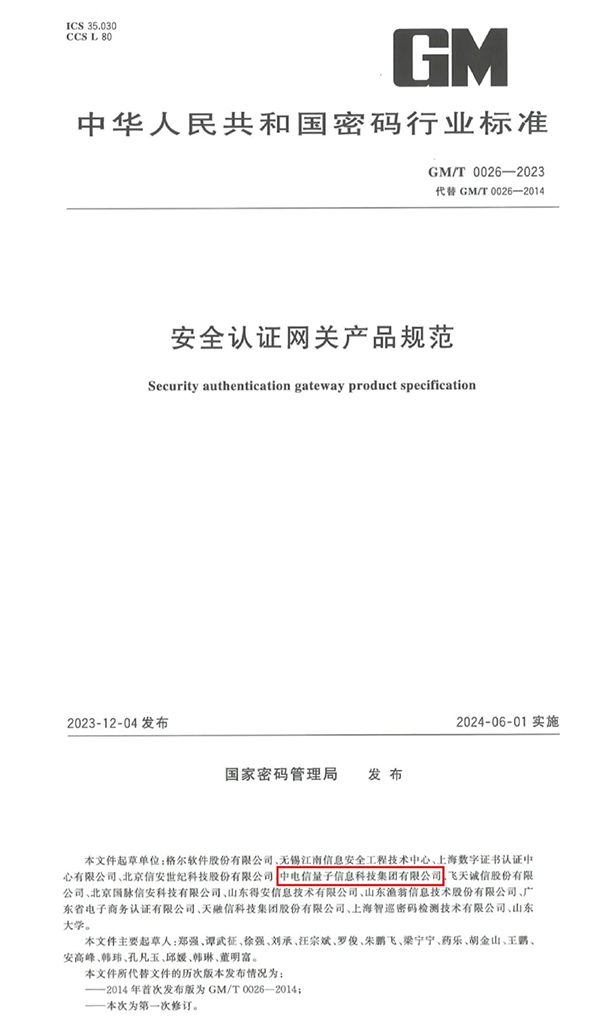 中電信量子集團積極參與行業(yè)標準制定,先后參與制定GM/T 0026-2023、GM/T 0025-2023等網(wǎng)關(guān)產(chǎn)品行業(yè)標準,為具體網(wǎng)關(guān)產(chǎn)品的使用、管理及合規(guī)性、某些功能項的實施和檢測方法、性能測試方法制定明確規(guī)范,提升網(wǎng)關(guān)產(chǎn)品安全性與合規(guī)性,推動技術(shù)創(chuàng)新與產(chǎn)業(yè)升級,規(guī)范市場秩序,提升用戶體驗與滿意度。