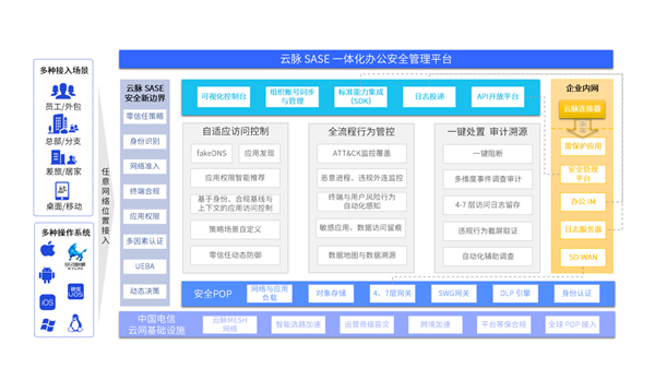 電信安全云脈 SASE 是一套遵循 Gartner SASE技術(shù)模型,融合了中國(guó)電信優(yōu)質(zhì)網(wǎng)絡(luò)與中國(guó)電信安全公司核心安全能力的新型辦公安全服務(wù)平臺(tái)。通過(guò)云脈客戶(hù)端、云脈 Mesh 網(wǎng)絡(luò)、云脈連接器三大核心組件,為用戶(hù)提供零信任網(wǎng)絡(luò)接入、數(shù)據(jù)外發(fā)管控、終端安全、IT 效能管理一體化能力。以云原生架構(gòu)讓安全內(nèi)置企業(yè)業(yè)務(wù),實(shí)現(xiàn)企業(yè)辦公安全和數(shù)據(jù)安全的協(xié)同管理,利用自然語(yǔ)言處理、用戶(hù)異常行為分析和機(jī)器學(xué)習(xí)算法等人工智能技術(shù),解決企業(yè)辦公網(wǎng)絡(luò)全I(xiàn)T架構(gòu)下的安全治理難題,使用戶(hù)在任何位置、通過(guò)任意終端均能高效、安全接入企業(yè)內(nèi)網(wǎng)。