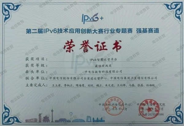 中電信數(shù)智科技有限公司和中國海洋石油集團有限公司聯(lián)合申報的“基于IPv6的企業(yè)互聯(lián)網(wǎng)收斂應用實踐”,榮獲“第二屆IPv6技術應用創(chuàng)新大賽”強基賽道二等獎;中電信數(shù)智科技有限公司(以下簡稱“電信數(shù)智”)、中國電信股份有限公司全渠道運營中心和中國電信集團衛(wèi)星通信有限公司聯(lián)合申報的“IPv6智慧運營平臺”,榮獲“第二屆IPv6技術應用創(chuàng)新大賽”強基賽道最佳實踐獎。