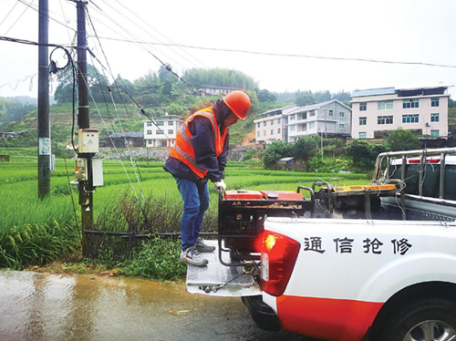 瀘州電信搶險隊(duì)伍冒雨出擊開展故障搶修工作。