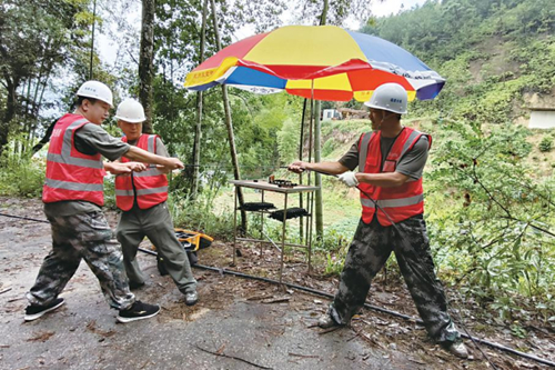 福州電信搶修人員在雨中布設(shè)應(yīng)急光纜。