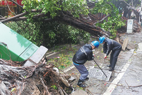 泉州電信搶修人員冒雨清理光纜線周邊枯枝。