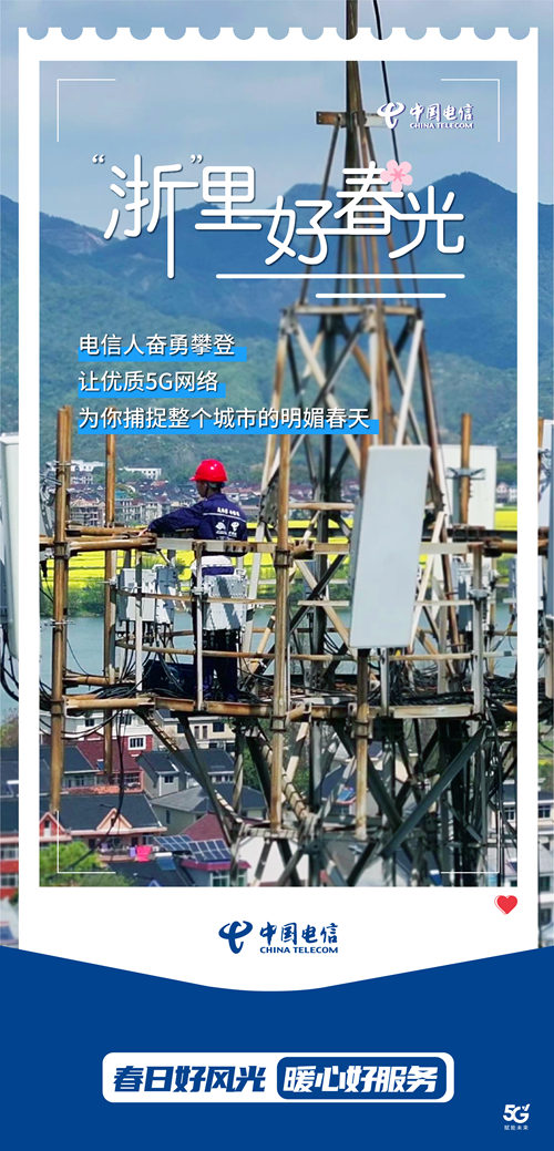 楊柳青青江水平,浙江春色滿城隅。在這春意盎然的時(shí)節(jié),中國(guó)電信浙江分公司深入鄉(xiāng)村,安裝和維護(hù)智能應(yīng)用,為廣大用戶“裝”點(diǎn)美好信息生活。愿我們的5G網(wǎng)絡(luò),如春風(fēng)拂面,讓您隨時(shí)分享生活的點(diǎn)滴,暢享春日好風(fēng)光。