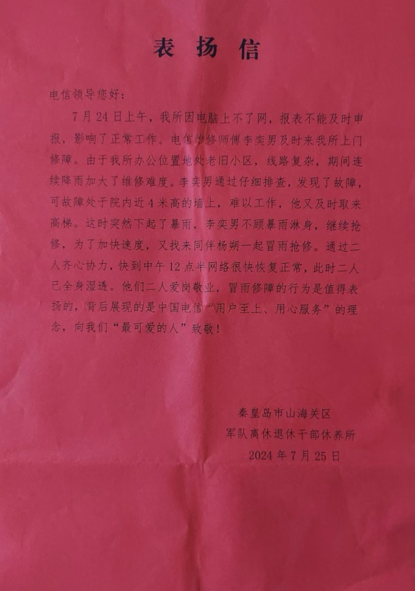 用戶的感激之情溢于言表,對兩位師傅的敬業(yè)精神、高效服務(wù)以及冒雨搶修的壯舉給予了高度評價,稱贊他們完美詮釋了中國電信“用戶至上,用心服務(wù)”的核心理念。次日清晨,用戶撰寫了一封熱情洋溢的表揚信,專程送往營業(yè)廳,再次向兩位師傅表示由衷的感謝。