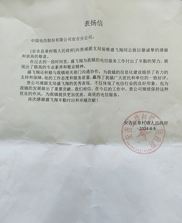 當(dāng)夜幕降臨鄉(xiāng)村小鎮(zhèn)漸漸安靜下來時,盛飛翔卻可能還在忙碌著。他可能會接到緊急搶修的電話然后迅速趕往現(xiàn)場;也可能會留在辦公室處理一些數(shù)據(jù)分析和報告撰寫的工作。無論多晚他都會堅守在自己的崗位上直到任務(wù)完成才肯離開。有時候正要入睡時,盛師傅會收到用戶求助短信,雖然來去也要不少時間,但他沒有一秒遲疑,騎上電動車就出發(fā),盛飛翔的服務(wù)態(tài)度和專業(yè)總是受到客戶方的夸獎,他們更是向支局送上表揚(yáng)信表揚(yáng)盛師傅。盛師傅說道:“路上半小時,修理1分鐘,但不管修不修得好,積極上門是一個態(tài)度和電信人的職責(zé)。”