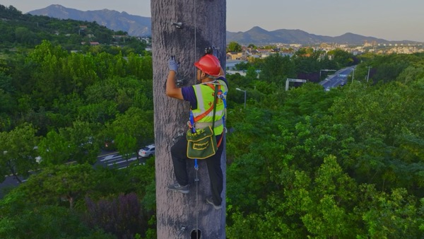 中國電信山東泰安分公司的基站維護人員不畏高空艱險,在山東泰山半山腰的電信落地塔和景觀塔上進行基站檢修,保障千家萬戶的信息通暢。
