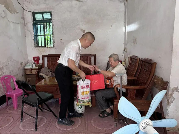 中國電信中山分公司駐鎮(zhèn)幫扶干部走訪貧困老人,為他們派發(fā)米面糧油等慰問物資。