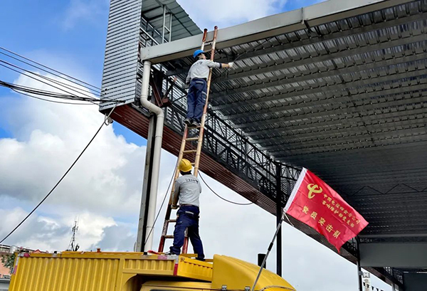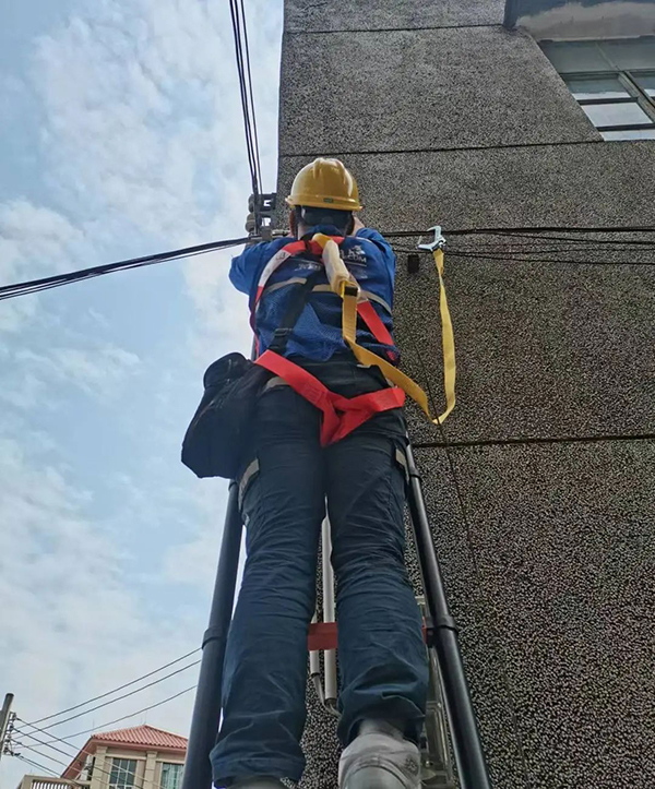 中國電信肇慶四會分公司客響維護(hù)部黨支部突擊隊隊員對通信光纜進(jìn)行升高操作。