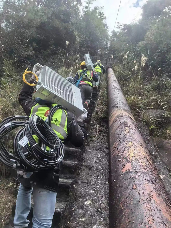 中國電信梅州分公司技術(shù)人員以通信“鐵軍精神”在短短8小時內(nèi)迅速開通距城區(qū)70多公里的渡田河水電站無線基站。