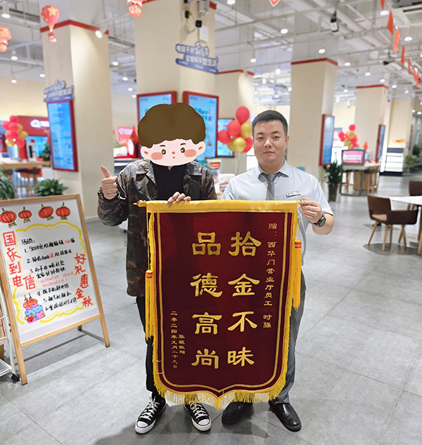 當(dāng)天下午,失主特意送來(lái)了錦旗,感謝時(shí)強(qiáng)拾金不昧的精神,并對(duì)電信培養(yǎng)出這樣的好員工連連稱(chēng)贊。時(shí)強(qiáng)用實(shí)際行動(dòng)詮釋了誠(chéng)信和友善的價(jià)值觀,傳遞了社會(huì)正能量。