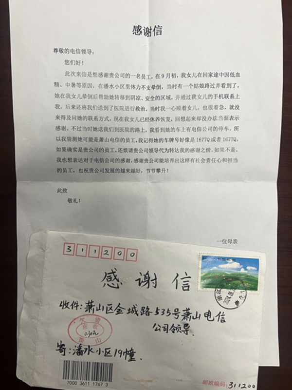 9月的一天,杭州蕭山區(qū)分公司收到一封感謝信,寄信人是一位母親,信中希望電信公司轉(zhuǎn)達她的感激之情。原來在前幾天,她的女兒因為低血糖在小區(qū)馬路邊暈倒,被一位好心的女士扶到路邊,并幫忙聯(lián)系了這位母親。當(dāng)這位母親匆忙趕到小區(qū)時,她的女兒已經(jīng)不省人事,正當(dāng)她不知道該怎么辦時,這位好心的女士眼疾手快將她的女兒扶上汽車,并親自開車送她們母女去醫(yī)院。當(dāng)時這位母親滿心滿眼都是昏倒的女兒,也來不及問那位好心的女士的聯(lián)系方式。過了幾天,等她的女兒恢復(fù)健康,她就立即寫了一封感謝信寄到電信公司,因為她在慌亂中唯一記下的就是那張電信公司停車證和車牌號的幾位數(shù)字。