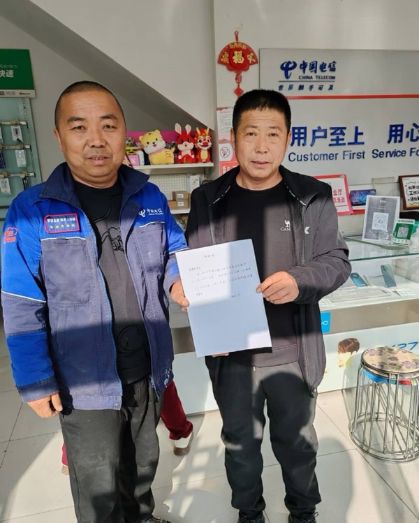 為了表達對李春軍貼心服務(wù)的深深感激,張全國親筆書寫了一封情真意切的感謝信,并將其送至電信公司。信中雖無華麗辭藻,但字里行間流露出的真摯情感卻令人動容。李春軍收到感謝信后深受觸動,他謙遜地表示:“無論是作為用戶的朋友還是同村的鄉(xiāng)親,這都是我應(yīng)該去做的事情??吹綇埲珖胰艘驗椤煲砜醇摇?wù)而感到安心,我也感到無比欣慰。今后,他們有任何困難,都請盡管聯(lián)系我,我會一如既往地為中國電信的用戶服務(wù),為鄉(xiāng)村振興事業(yè)添磚加瓦。”