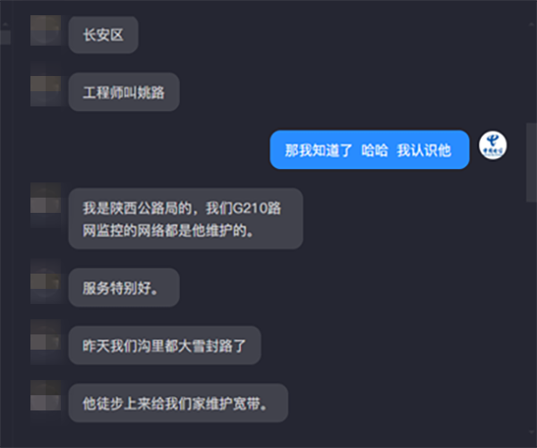 近日,陜西電信抖音號(hào)收到用戶私信,用戶在私信對(duì)話中特別感謝了中國(guó)電信西安長(zhǎng)安區(qū)分公司青華支局智慧家庭工程師姚路,“昨天我們溝里都大雪封路了,他徒步上來(lái)給我們家維護(hù)寬帶,服務(wù)特別好”。
