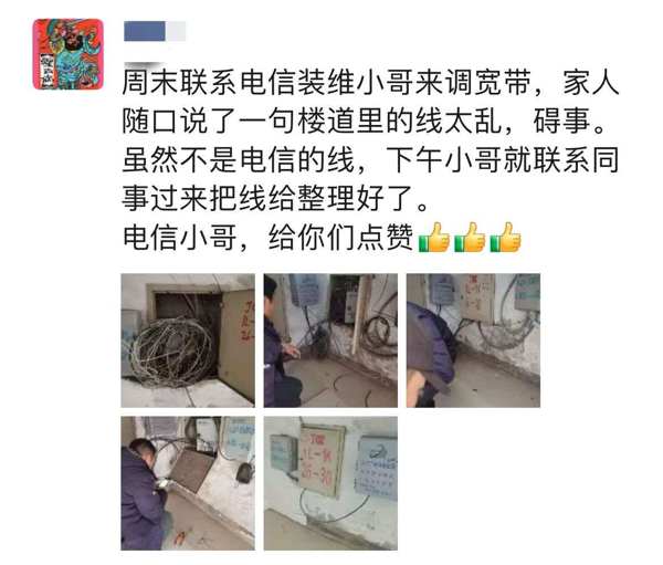 近日,河北保定定州明月豪苑的陳先生在安裝寬帶的過程中,家人隨口說了一句樓道的線路太亂,不僅僅影響美觀,而且還存在很大的危險性。這句話被智家工程師胡楊楊和彭飛默默地記在了心里。他們周末放棄了休息,來到用戶說的位置。現(xiàn)場線路非常復(fù)雜——多家運營商線路混雜在一起,他們看著糾纏不清的各類線纜,沒有絲毫抱怨,而是立刻投入工作。憑借豐富的經(jīng)驗和專業(yè)知識,重新規(guī)劃布局。仔細分辨并且將一根根網(wǎng)線標(biāo)注好連接的房間與設(shè)備,用束線帶將網(wǎng)線整齊歸類,線槽有序固定,破損老化的部分被精準(zhǔn)更換。經(jīng)過數(shù)小時的精心整理與調(diào)試,雜亂無章的線路消失不見,存在危險的環(huán)境立刻變得干凈整齊。陳先生看著整齊的線路,不禁豎起大拇指:“以前總為這堆網(wǎng)線頭疼,沒想到電信師傅一來,全給整明白了,這服務(wù)太專業(yè)、太貼心了!”