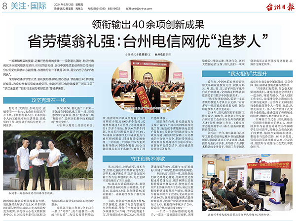 近日,中國電信浙江臺州分公司翁禮強勞模創(chuàng)新工作室獲評浙江省勞模工匠創(chuàng)新工作室。這家由新時代浙江萬名好黨員、浙江省勞動模范、中國電信集團勞動模范、臺州市勞動模范、浙江工匠、浙江金藍領、臺州工匠、高級技師翁禮強領銜,合力眾多專業(yè)骨干人才所創(chuàng)立的創(chuàng)新工作室,自2016年成立開始,就一直致力于5G移動網絡、行業(yè)融合應用、社會民生服務、通信疑難問題攻堅等領域的創(chuàng)新研發(fā)。