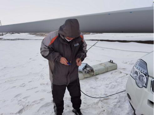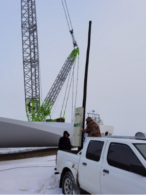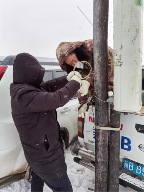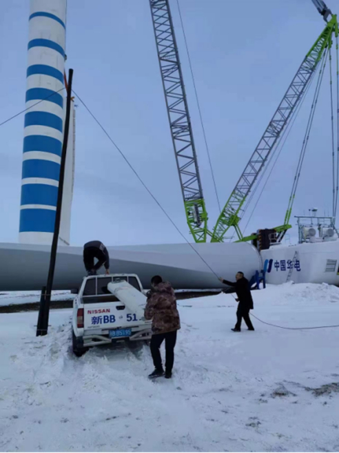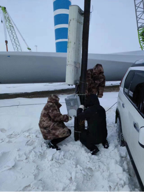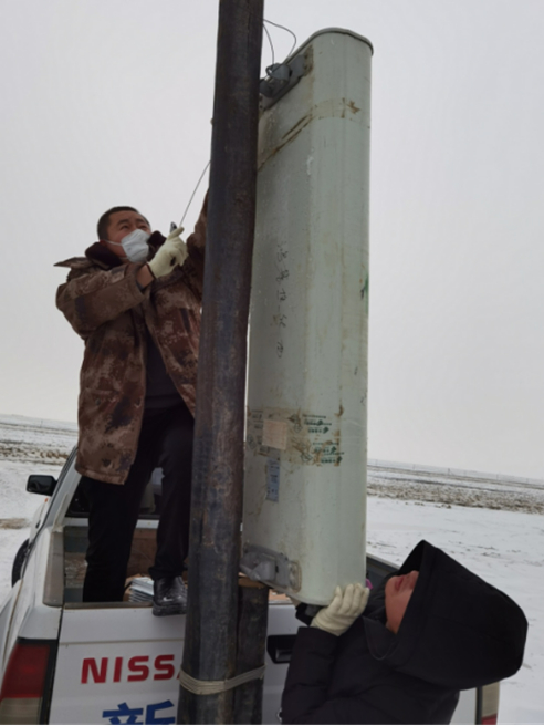 12月1日午時(shí),2車5人保障小組來(lái)到了華電220項(xiàng)目部,與華電工程人員對(duì)接后到保障現(xiàn)場(chǎng)進(jìn)行查勘。電信小組成員依據(jù)周圍資源情況,決定采取在施工現(xiàn)場(chǎng)路邊的光纜桿路上臨時(shí)架設(shè)4G基站的施工辦法。中國(guó)電信新疆木壘分公司員工李發(fā)斌站在皮卡車斗進(jìn)行基站設(shè)備固定,他的同事楊志堅(jiān)與其他人在下面肩扛手抬地托著設(shè)備。由于風(fēng)電場(chǎng)地處戈壁灘,風(fēng)大、嚴(yán)寒,雖然小組隊(duì)員們已提前穿好御寒衣物,但是不一會(huì)就手麻腳凍。在架設(shè)基站過(guò)程中,大家輪流到車?yán)锶∨缓罄^續(xù)進(jìn)行安裝調(diào)試。